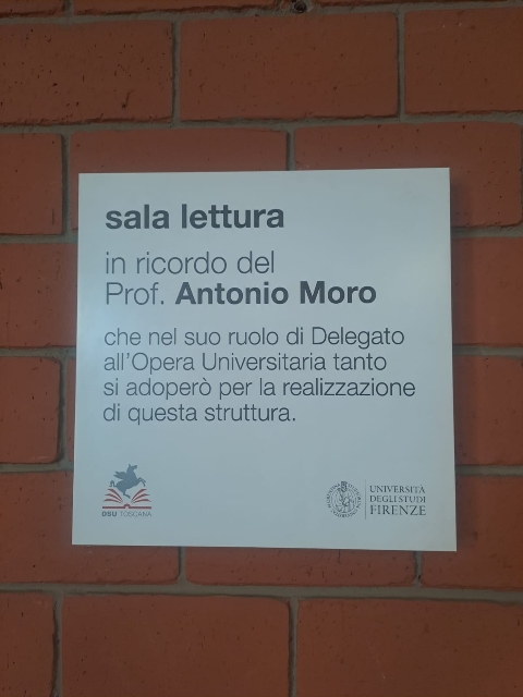 La scelta di uno spazio all'interno della Residenza Calamandrei ove apporre la targa non è casuale in quanto il professor Moro è stato nella seconda metà degli anni settanta presidente dell'Opera Universitaria di Firenze, l'istituzione che erogava servizi di supporto agli studenti prima che questa si trasformasse in Azienda Regionale.